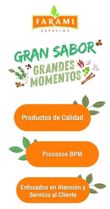 Fabricar y suministrar, a través de nuestra marca FARAMI, soluciones integrales de especias y productos de alta calidad dirigidas a organizaciones productivas, empresariales e industriales.